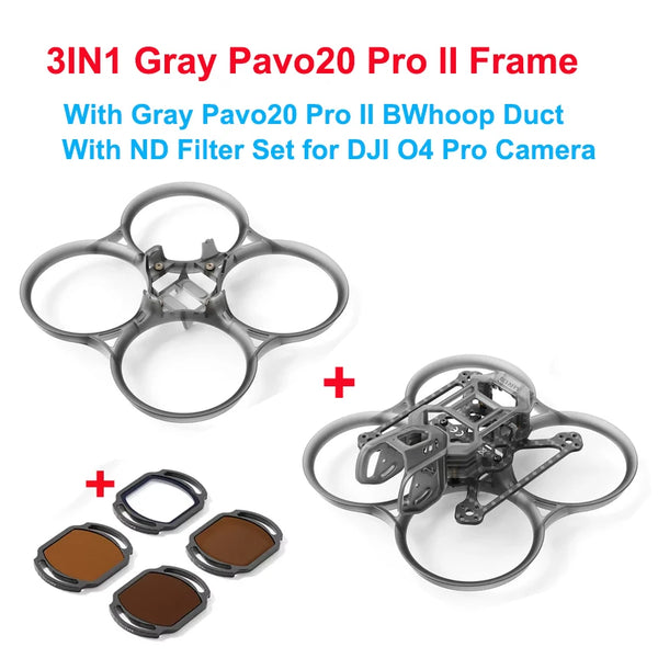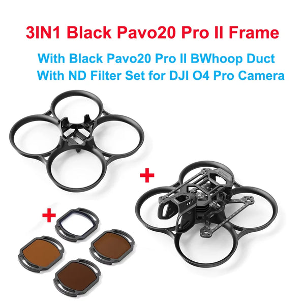 The Pavo20 Pro II Brushless Whoop Frame is tailored for the 2.2″ Pavo20 Pro II cinewhoop, now offering expanded compatibility with both DJI O4 Air Unit and O4 Air Unit Pro through its new carbon plate. Its revolutionary assembly system upgrades to a 4-screw configuration with embedded nuts and supported structure, enabling quicker, more secure builds with exceptional rigidity. Designed with a 93.9mm wheelbase and constructed from crash-proof PA12 thickened whoop ducts, this frame combines durability with aerodynamic efficiency, delivering an 8-11% thrust boost. Perfectly paired with a robust 3S propulsion system, it generates unparalleled power for freestyle and cinematic flights. Available in classic black and transparent grey.