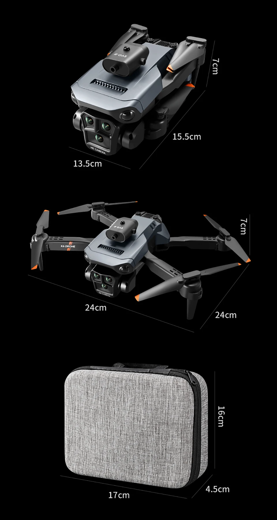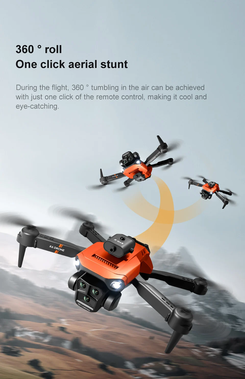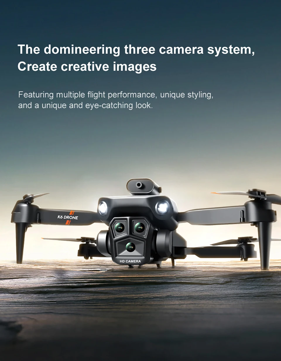 1. The front three 4k wide-angle HD esc lenses support vertical/horizontal/top view The rare three-camera system on the market supports horizontal, vertical and overhead shooting, giving you more room for creativity.